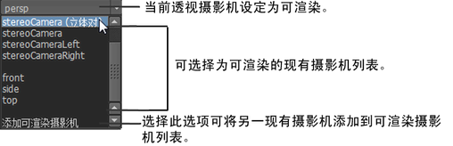 第二个和第三个区域列出了可选择为可渲染的现有摄影机,例如,立体摄影机与正面和侧面摄影机。