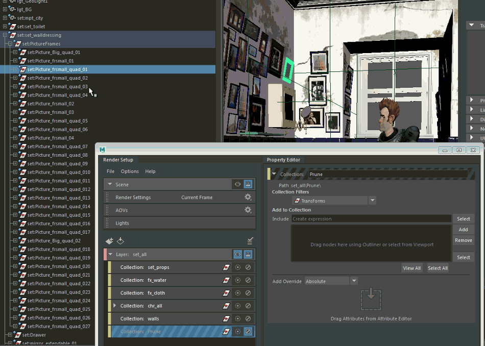 此规则允许您从 DAG 层次中删减特定对象,使其不会显示在场景中。示例应用程序可能是一面悬挂了 20 帧的墙,而您要移除其中的 6 帧。这些帧是墙层次的子节点或孙节点,而该面墙位于层中的集合内。