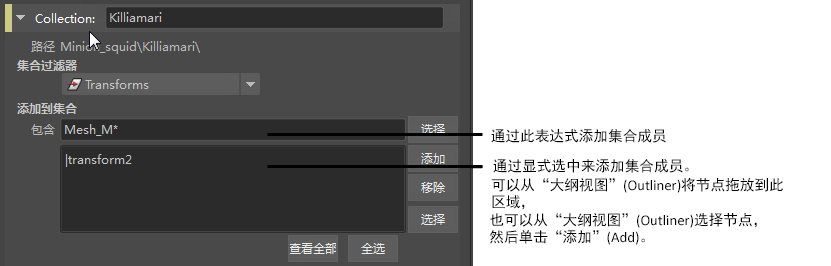 默认情况下,只有与表达式匹配的变换节点才会包含在集合中。对于高级用户,您可以使用“集合过滤器”(Collection Filters)下拉菜单调整集合过滤器,从而将其他类型的节点包含在集合中;例如:着色器、形状、着色引擎和集等。通过选择“全部”(All)集合过滤器,您甚至可以包含所有节点,而不考虑类型。