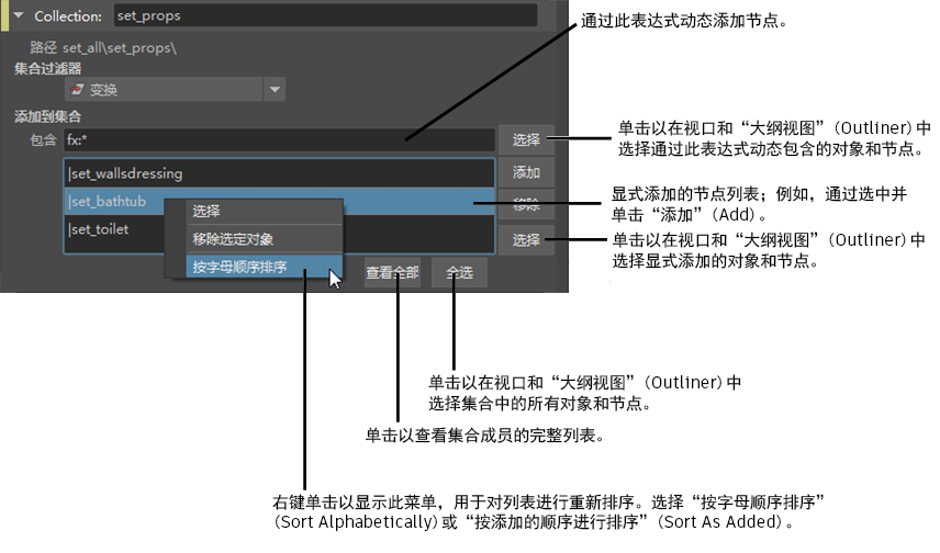 您可以将成员静态添加到集合(通过显式选择并添加节点),而不是动态执行此操作(使用表达式,如上所述)。为此,请使用鼠标中键将节点从“大纲视图”(Outliner)拖放到“特性编辑器”(Property Editor)。或者,可以在“大纲视图”(Outliner)中选择节点,然后在“特性编辑器”(Property Editor)中单击“添加”(Add)。