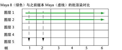 在先前版本的 Maya 中执行命令行渲染时,会先渲染帧的每个渲染层,然后再移动到下一帧。