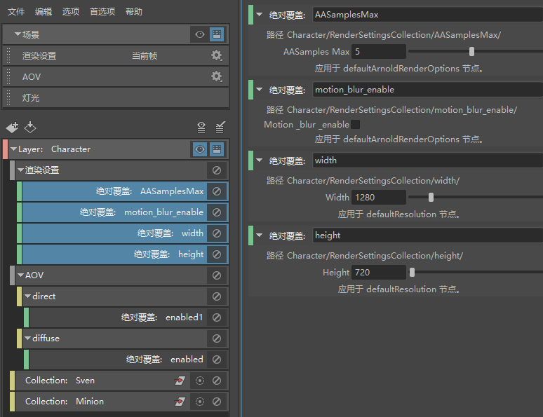 处理渲染层以及创建“渲染设置”(Render Settings)和 AOV 覆盖时,您可能希望导出应用覆盖值的“渲染设置”(Render Settings)的 .json 文件,然后将此预设导入到新场景中。同样,您可能希望导出和导入应用覆盖值的 AOV。