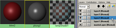- 也可以按照以下方法针对每一层覆盖材质和着色器:在“渲染层编辑器”(Render Layer editor)中,在某一层上单击鼠标右键,然后从出现的菜单中选择“覆盖 > 创建新的材质覆盖”(Overrides > Create New Material Override)或“指定现有材质覆盖”(Assign Existing Material Override)。