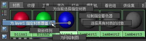 - 从“Hypershade”中选择材质或创建新材质。若要将该材质指定给层,请选择相应的层并使用鼠标中键将材质样例拖放到对象上。