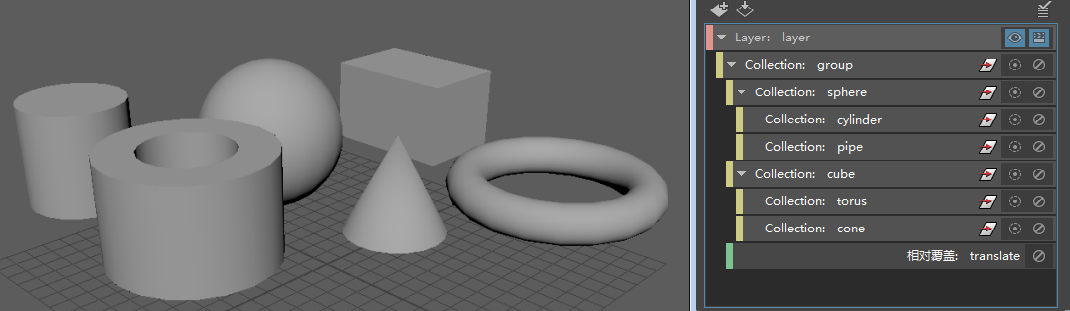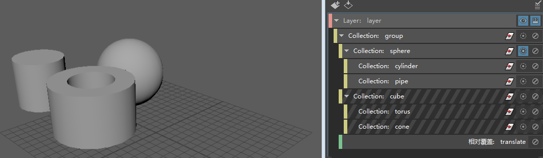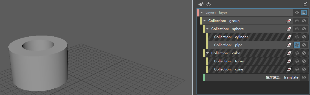 在本示例中,当您隔离选择管道集合时,只有管道会显示在视口中。球体父集合保持启用状态,但其中所含的球体不会显示在视口中。这允许父集合上的覆盖(在本例中,是指应用于组集合的“平移”(Translate)覆盖)继续应用于管道集合。