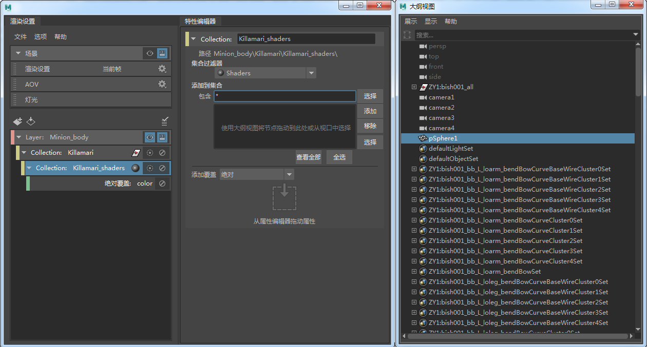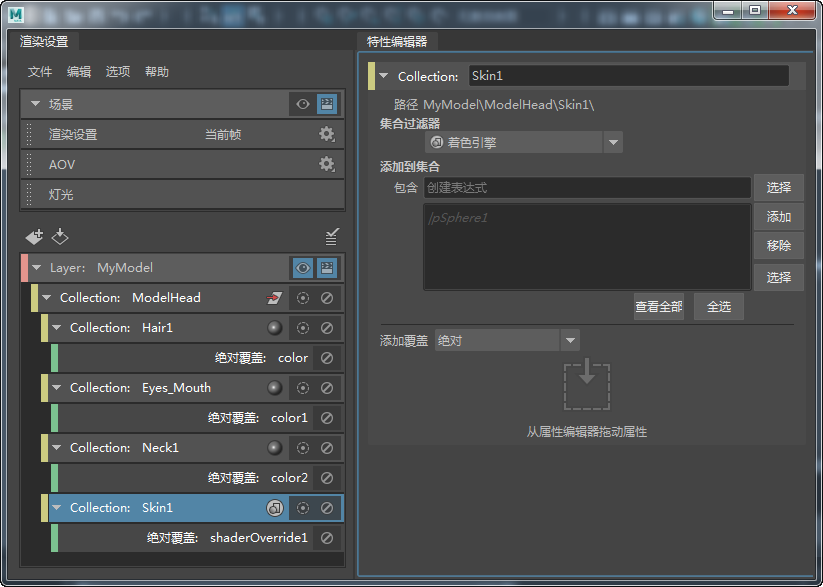 名为 ModelHead_shadingEngines 的集合将随对应的着色器覆盖一起创建。选择该集合可看到“集合过滤器”(Collection Filters)已设置为“着色引擎”(Shading engines)。该集合包含应用于头部模型的所有着色引擎。