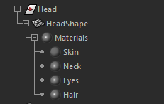 ModelHead_shaders 子集合将随对应的颜色覆盖一起创建。如前所述,所有“蒙皮”(Skin)、“头发”(Hair)、“颈部”(Neck)和“眼”(Eyes)着色器均包含在该集合中。