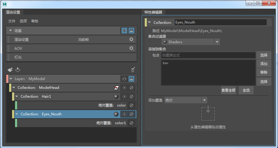 - 选定 ModelHead_shaders 子集合的情况下,单击“特性编辑器”(Property Editor)中的“全选”(Select All),单击“添加”(Add),然后移除皮肤、颈部和头发,只留下眼睛。从表达式字段中移除 *。