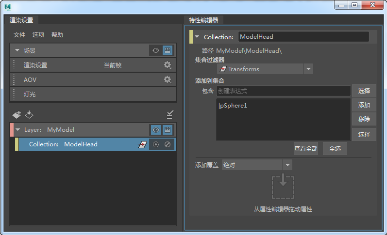 - 选定 ModelHead 集合后,从“大纲视图”(Outliner)中选择“头部”(Head),然后在“特性编辑器”(Property Editor)中单击“添加”(Add),将其添加到集合中。