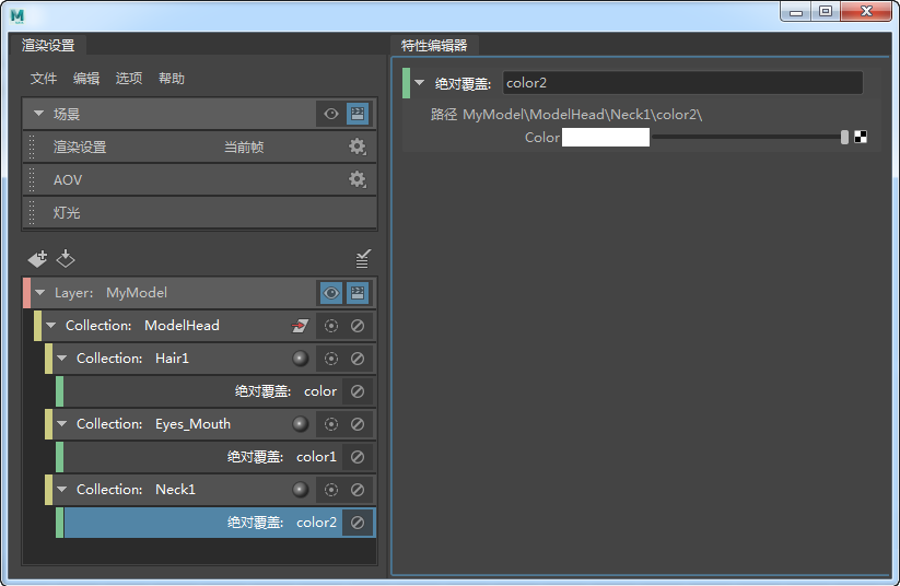 - 当 MyModel 层仍然设置为可见时,再次选择 ModelHead 集合,然后选择任一着色器;例如,“颈部”(Neck)。在“颈部”(Neck)着色器的“属性编辑器”(Attribute Editor)中,在“颜色”(Color)属性上单击鼠标右键,然后选择“为可见层创建绝对覆盖”(Create Absolute Override for the Visible Layer)。