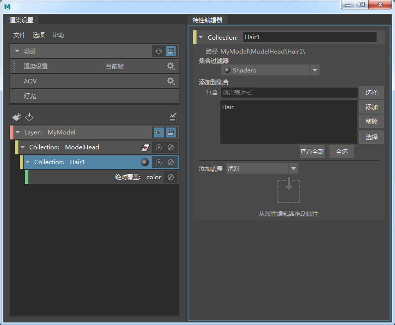 ModelHead_shaders 子集合将随对应的颜色覆盖一起创建。选择该集合可看到在“特性编辑器”(Property Editor)中,“集合过滤器”(Collection Filters)已设置为“着色器”(Shaders)。