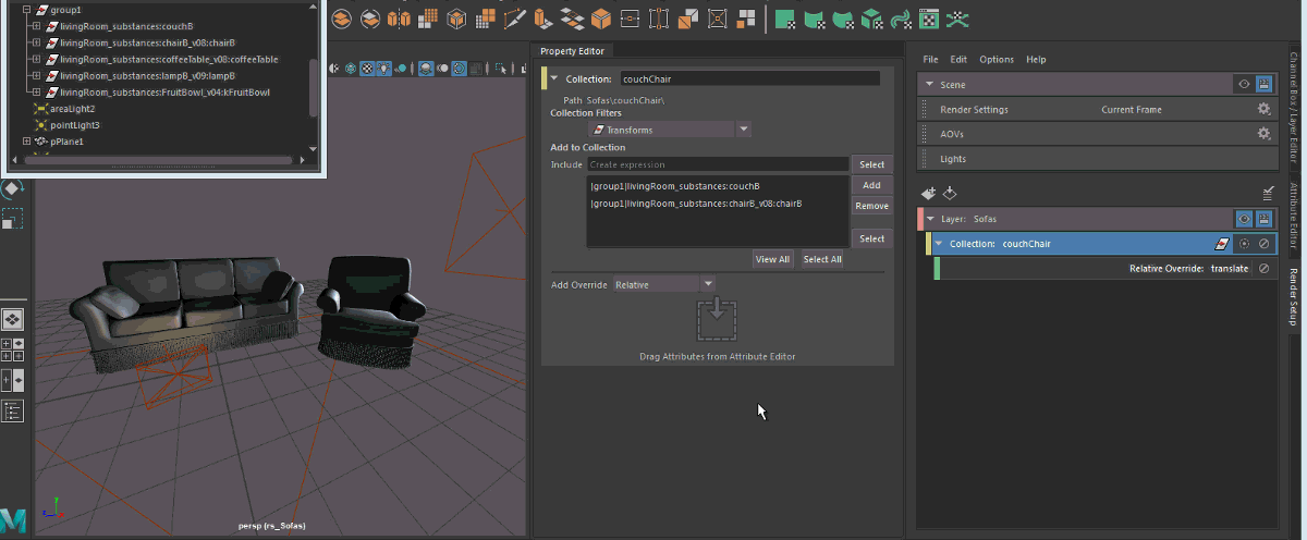 在本示例中,沙发和椅子均已添加到集合中,方法是选择其父节点并单击“添加”(Add)。