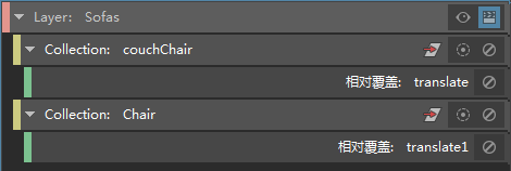 在本示例中,为包含椅子的集合创建了一个平移覆盖,此外也为同时包含沙发和椅子的集合创建了一个平移覆盖。如果选择椅子并在视口中对其进行操纵,则会影响 Chair 集合的平移覆盖,因为它显示在列表中更靠后的位置,因此具有较高优先级。