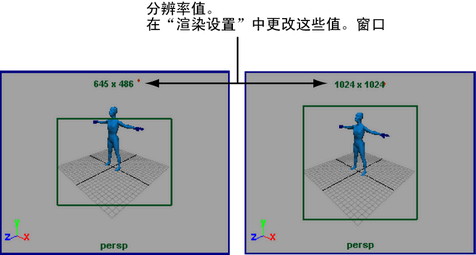 “分辨率门”(Resolution Gate)的尺度表示渲染分辨率(要渲染的区域)。渲染分辨率值在视图中显示在“分辨率门”(Resolution Gate)上方。可以在“渲染设置”(Render Settings)窗口的“图像大小”(Image Size)区域中更改这些尺度。