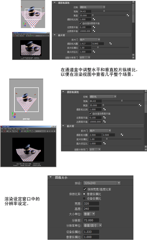 胶片门并不表示渲染区域。使用摄影机“属性编辑器”(Attribute Editor)中的“摄影机光圈”(Camera Aperture)和“胶片适配”(Film Fit)属性,可以自定义该区域。也可以使用“渲染设置”(Render Settings)窗口中的“图像大小”(Image Size)选项来设定渲染分辨率,然后选择锁定“设备纵横比”(Device aspect ratio),或设定“设备纵横比”(Device aspect ratio)属性。