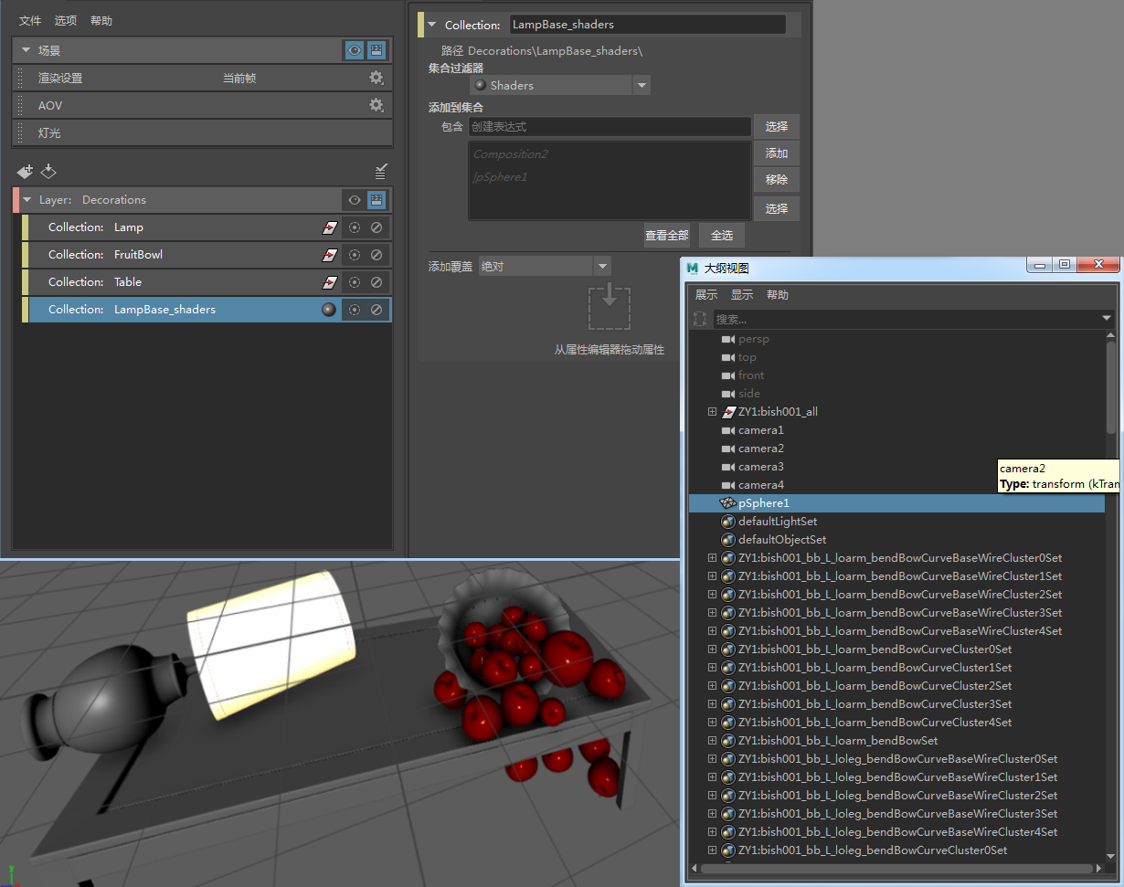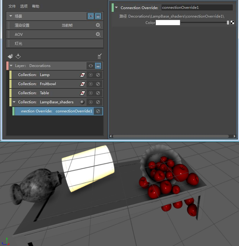 连接覆盖将应用于集合中的所有着色器;例如,在本例中:LampBase_shaders 集合中的 lampBody_blinn 和 lampBase_lamber。如果还为果盘指定了 lampBody_blinn 或 lampBase_lambert 着色器,即使最初意图是仅覆盖灯的透明度,也会应用透明度覆盖。因此,有必要验证应用于层中每个对象的着色器,以避免意外覆盖对象的着色器。为此,请在“大纲视图”(Outliner)中选择“显示 > 指定的材质”(Display > Assigned Materials)。