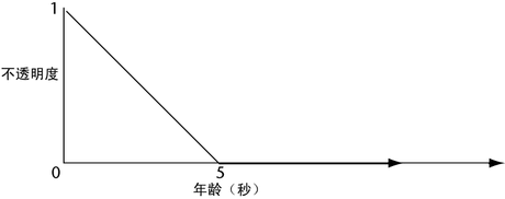如下表所示,不透明度在对象年龄的前 5 秒中以线性增量增加。在指定的 0 到 5 秒年龄范围内的中点处,不透明度为 0.5。在 0 和 5 秒的 3/4 处,不透明度为 0.75。在对象年龄的 5 秒处,不透明度为 1。5 秒后,不透明度将保持为 1。