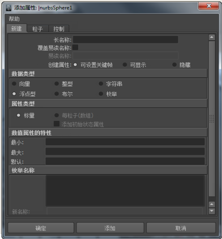 “最小值”(Minimum)和“最大值”(Maximum)设定您可在“属性编辑器”(Attribute Editor)或“通道盒”(Channel Box)中为属性输入的最低值和最高值。