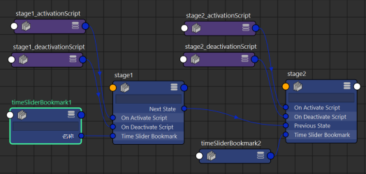 - (可选)将“时间滑块书签”(Time Slider Bookmark)节点连接到阶段节点,以在阶段激活时自动框显这些书签。