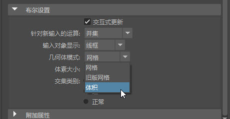 从布尔节点的“几何体模式”(Geometry Mode)下拉列表中激活“体积”(Volume)。还可以使用布尔堆栈来更改输入对象的显示模式。