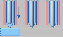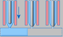 (A) 第 1 个阀浇口打开,允许熔体流入型腔,(B) 熔体持续仅流过第 1 个浇口,(C) 熔体经过第 2 个浇口后,第 2 个阀浇口立即打开,允许熔体流过第 2 个浇口,(D) 熔体经过第 3 个浇口时,第 3 个阀浇口打开,使熔体通过第 3 个浇口进入型腔。