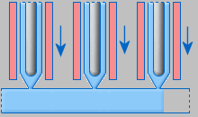 顺序阀浇口有助于控制注射成型工艺的几个关键领域:平衡、流动控制和灵活性。熔接线可以精确定位在两个阀浇口之间,方法为打开一个浇口持续特定时段,然后再打开第二个浇口。对于具有多个浇口的长零件,在聚合物熔体流过浇口后按顺序打开浇口,可消除因塑料流动不受控可能发生的瑕疵。下图为所有阀同时打开和按顺序打开时的聚合物流动图。所有浇口同时打开时,熔接线在聚合物流相遇处形成。每个后续浇口在熔体流过后打开时,熔接线将消除。