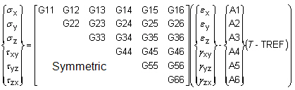- 材料属性矩阵:此按钮可激活以下窗口,用户可在窗口中定义 Gij 矩阵及热膨胀系数项。
