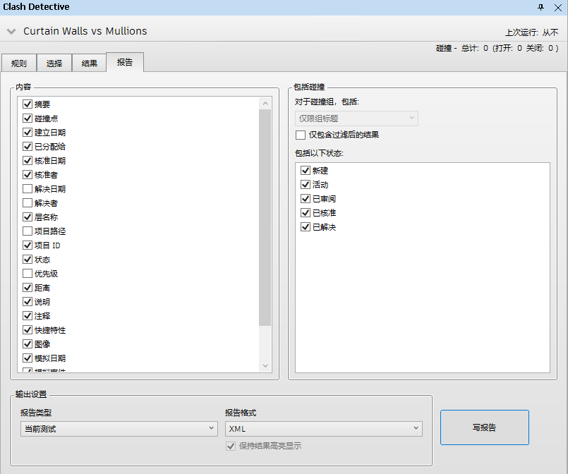 选中此字段中的复选框可以指定要包含在报告中的碰撞状态。