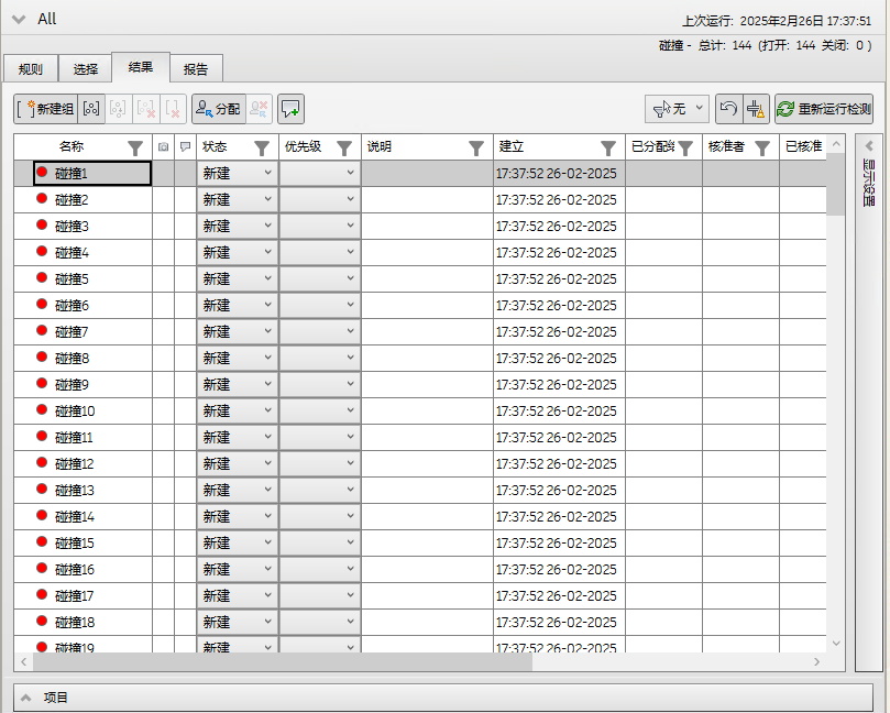 通过“结果”选项卡,您能够以交互方式查看找到的碰撞。它包含碰撞列表和一些用于管理碰撞的控件。
