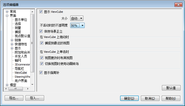 在“选项编辑器”>“界面”节点 >“ViewCube”页面中,从“不活动时的不透明度”下拉列表中选择一个选项。