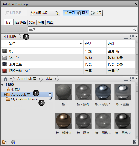 3 - 文档材质库。包含在当前打开的文件中使用或定义的材质,且这些材质仅可以在当前文件中使用。