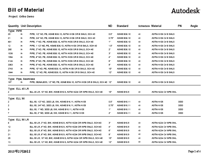 生成 Plant 3D 的 BOM 表。请参见下面的样例报告。