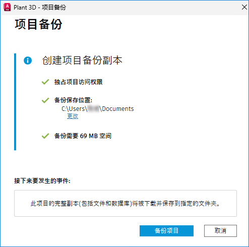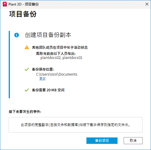 如果其他用户检出协作项目中的项目设置或图形,该对话框将显示一条警告消息。您仍然可以继续进行备份,但备份不会包括未保存的更改。