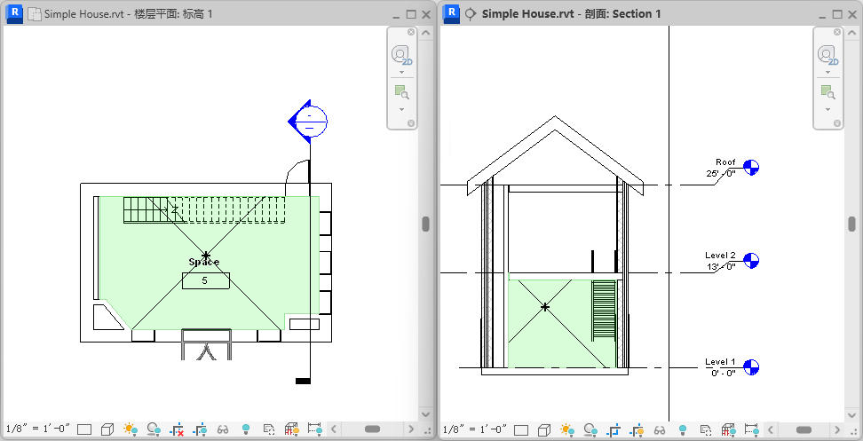 - 关闭除要放置空间的剖面视图和楼板平面外的所有视图,然后在键盘上键入 w t 以平铺这两个视图。