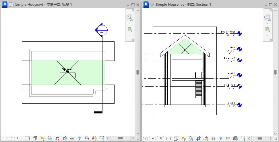 - 关闭除要放置空间的剖面视图和楼板平面外的所有视图,然后在键盘上键入 w t 以平铺这两个视图。