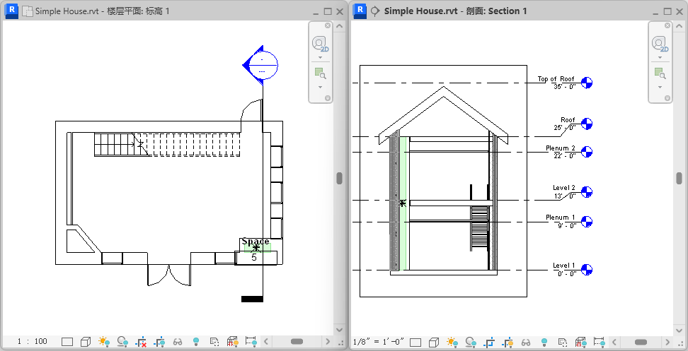 - 关闭除要放置空间的剖面视图和楼板平面外的所有视图,然后在键盘上键入 w t 以平铺这两个视图。