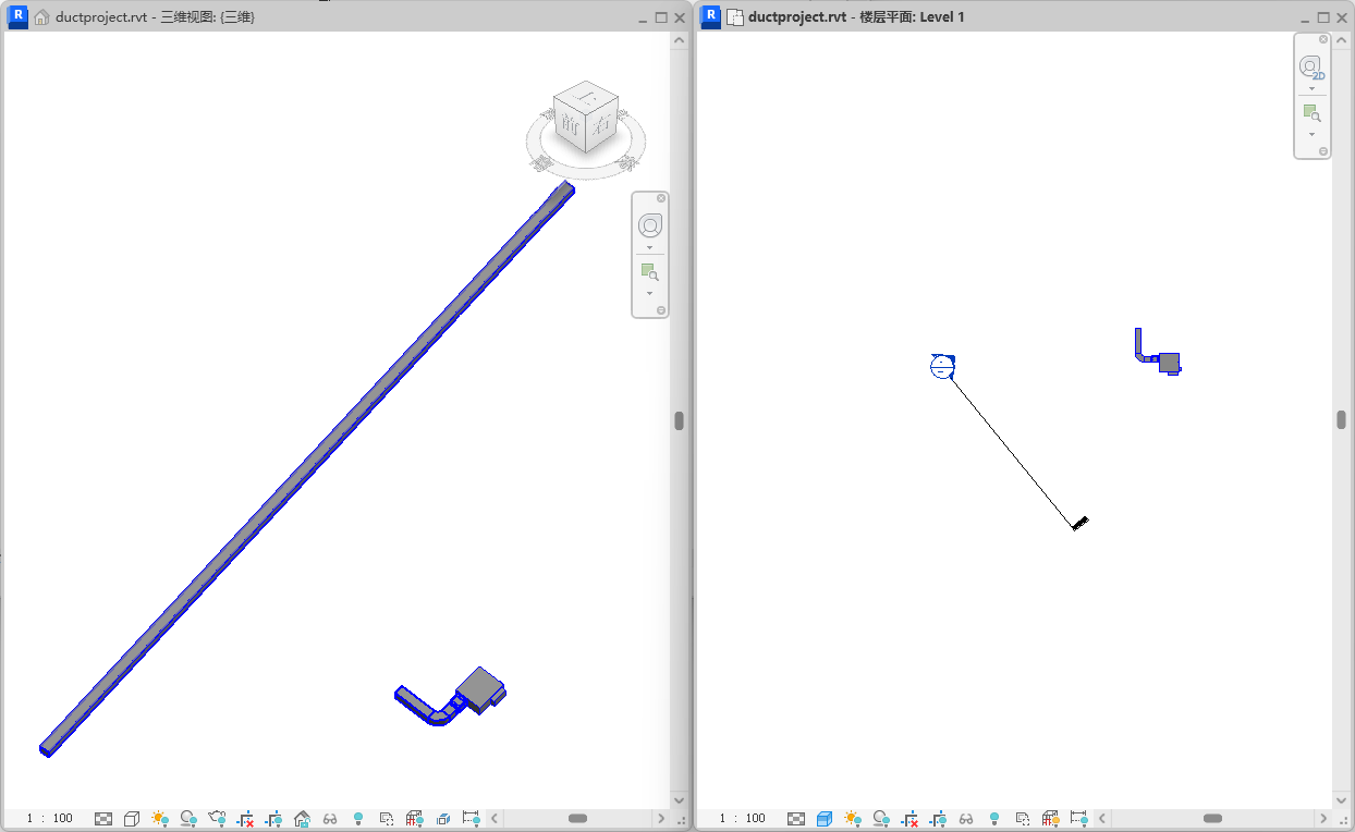 关联三维视图显示了实际创建管网的方式。绘制的结果管网中有一条垂直管段和一条水平管段,并连接到了标高 2 上的管网。 添加的水平管段与剖面视图平面垂直。