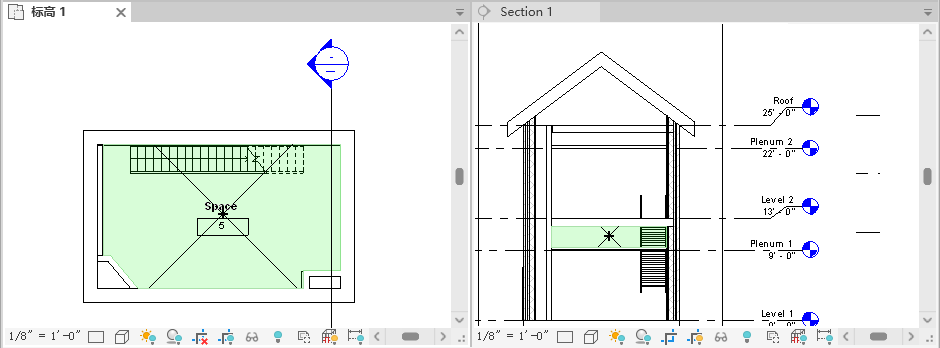 - 关闭除剖面视图和正压送风系统标高楼板平面视图外的所有视图,然后使用键盘键入“w t”以平铺这两个视图。