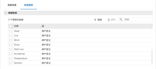 注: 您可以编辑或删除手动添加的荷载性质。无法编辑或删除选定设计规范提供的荷载性质。这些内容仅通过选择其他设计规范进行更新。
