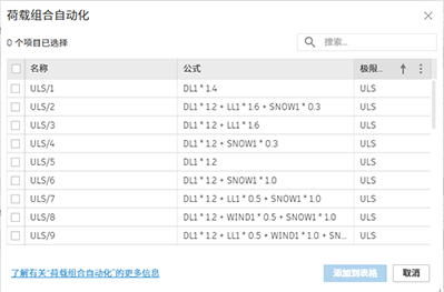 您可以根据选定区域/国家/地区和设计规范使用“自动荷载组合”生成器。