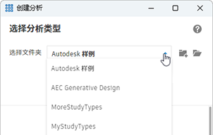 要使用 Autodesk 示例之一创建分析,请在“创建分析”对话框中,为“选择文件夹”选择“Autodesk 样例”。