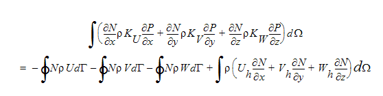 In these equations, the Uh, Vh, Wh terms contain all of the off-diagonal terms in the momentum equations. If these three equations are now substituted into the previous continuity equation, the following pressure equation results: