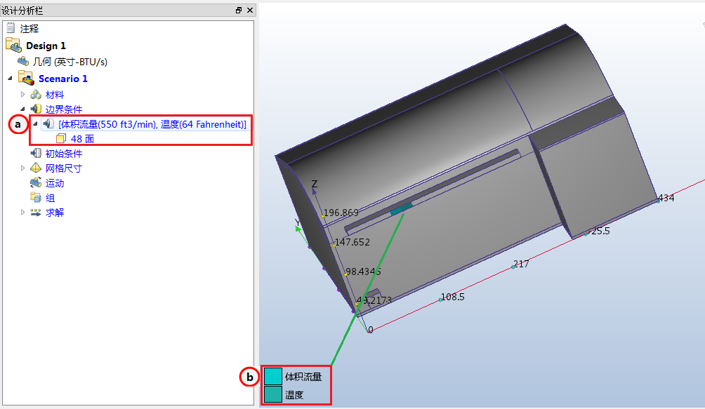 15. 要验证两个边界条件是否已正确指定给送风面,请查看设计分析栏和送风面上的彩色条纹: