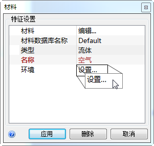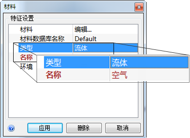 4. 在“材料”快速编辑对话框中,确认“类型”为“流体”,并且“名称”为“空气”。