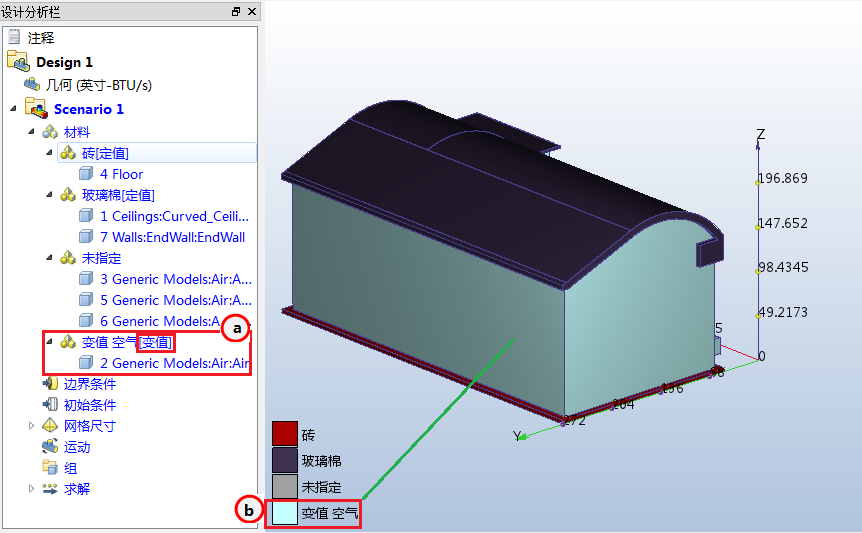 9. 要验证空气材料是否已正确指定,请查看设计分析栏和部件颜色:
