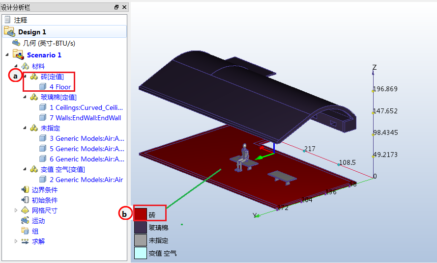 7. 要验证“砖”材料是否已正确指定,请查看设计分析栏和部件颜色: