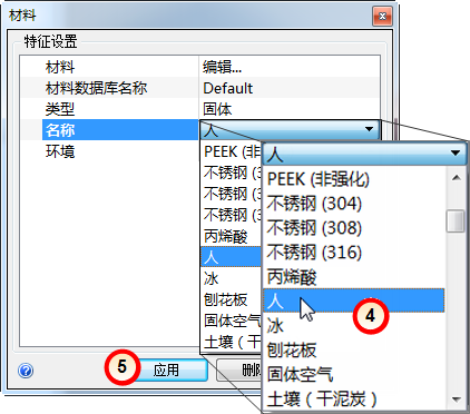 在此步骤中,我们将为参观者指定模拟人体热物理特性的材料。默认安装的材料数据库不包含实际的“人体”材质,因此我们将使用硅作为近似模拟。更严格的方法是,创建具有人体实际特性的材料,并将其添加到自定义材料数据库中。