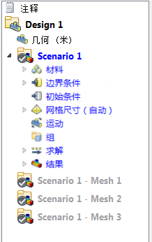 设计分析结束时,“工况1”中将包含最终的网格。“工况1 - 网格1”、“工况1 - 网格2”和“工况1 - 网格3”中将包含中间网格。设计分析栏应如下所示: