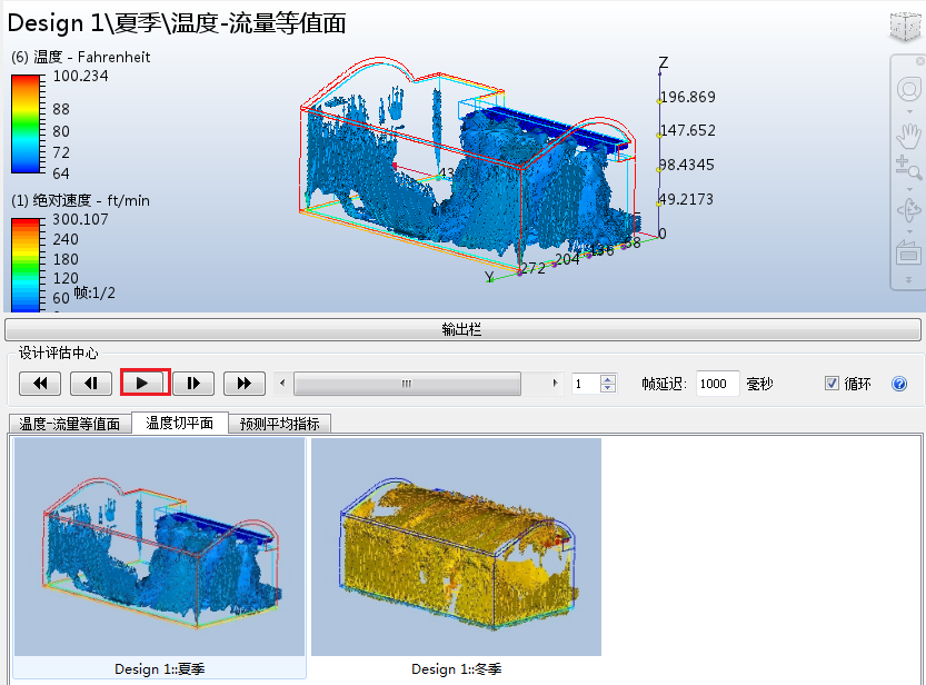 在上一步中,我们观看了门厅中央的温度变化,见证了“夏季”和“冬季”工况之间的显著差异。在此步骤中,我们将使用等值面摘要图像来更好地了解流体和温度之间的相互作用。