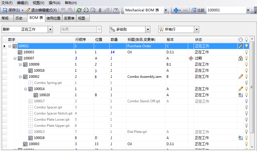 | 条目行处于开启状态。条目包含在所有 BOM 表流程中。 |